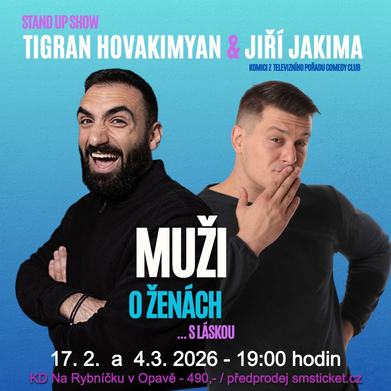 Komici z televizního pořadu "Comedy Club" Tigran Hovakimyan a Jiří Jakima přijíždí do vašeho města, aby bez obalu rozebrali téma muži versus ženy. Chtěli jste vždycky vědět, co si muži myslí o něžném pohlaví, ale báli jste se zeptat? Potom je stand-upová komediální show "Muži o ženách" právě pro vás!